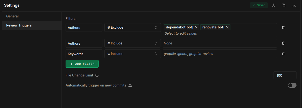 Control when Greptile performs reviews. This affects developer workflow and review frequency.- Dashboard
